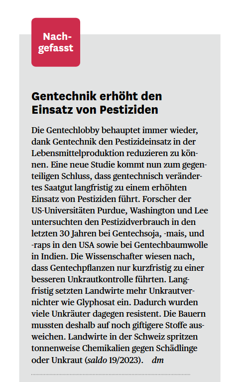 Auch im Rahmen der Sortenentwicklung mithilfe der neuen Gentechnik (NGT) stehen Pestizidresistenzen, die auf einem oder wenigen Gene beruhen, häufig im Fokus. Denn solche Eigenschaften lassen sich technisch relativ einfach realisieren. In Bezug auf die Folgen unterscheiden sich die NGT-Sorten nicht von Sorten aus alter Gentechnik. Auch bei der neuen Gentechnik ist damit zu rechnen, dass Unkräuter und Schädlinge infolge des erhöhten Selektionsdrucks Resistenzen entwickeln und der Pestizideinsatz daher wieder erhöht wird. Auch die in der Studie betrachteten sozioökonomischen Folgen der Verwendung von GV-Saatgut dürften gleichermassen bei NGT-Pflanzen auftreten.