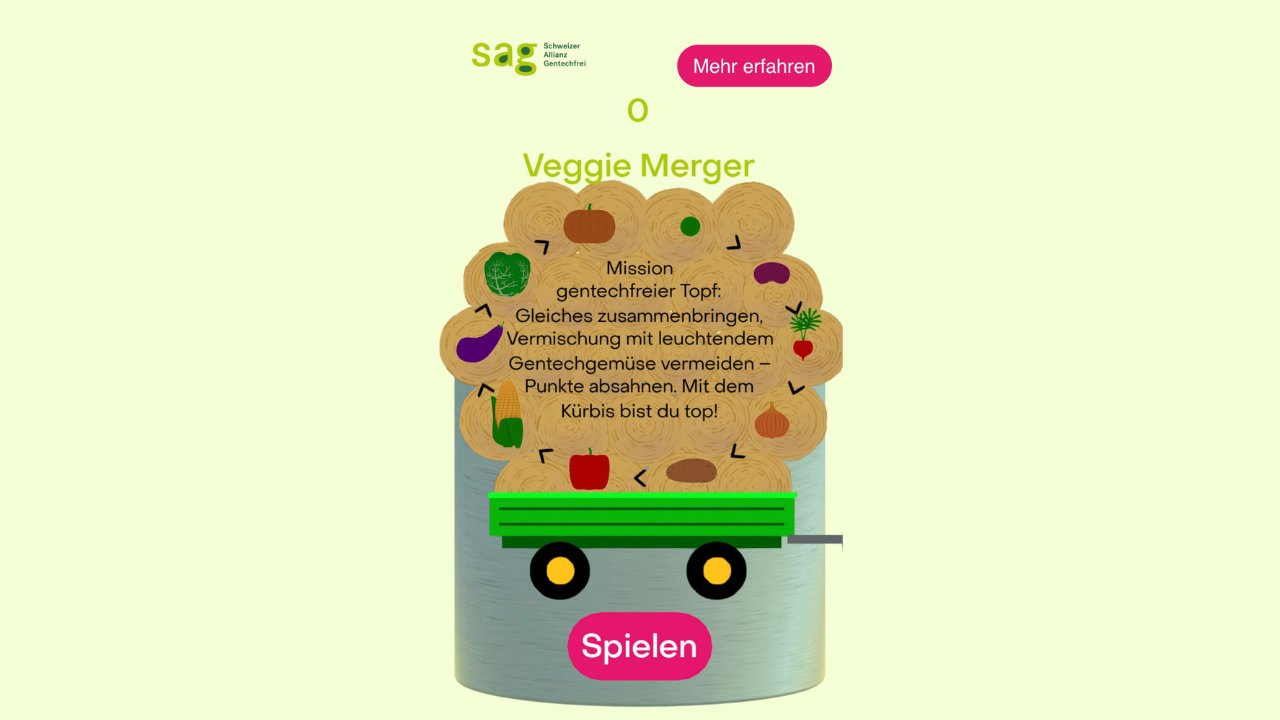 Im neuen SAG-Game «Veggie-Merger» siehst du, wie schnell sich Gemüse mit und ohne Gentechnik vermischen. Eine Kontamination mit Gentechnikgemüse lässt sich kaum verhindern.